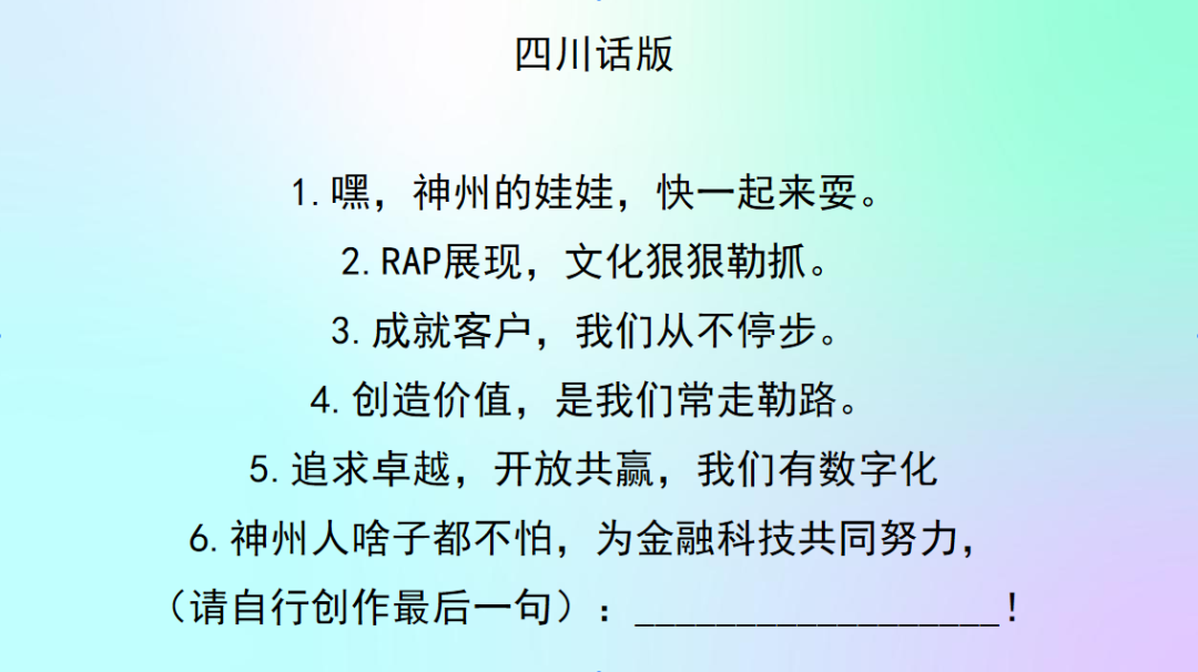 你对BB贝博艾弗森官网的新文化价值观熟悉吗?来来来,欢迎来参加神州Rapper挑战赛!让我们用最嗨皮的方式说出我们对BB贝博艾弗森官网新文化的理解。速度为王,又快又好!